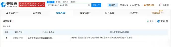 经营风险信息显示,今年7月,长沙蓝北文化传媒有限公司因未依照规定的期限公示年度报告,被长沙市雨花区市场监督管理局列入经营异常名录。