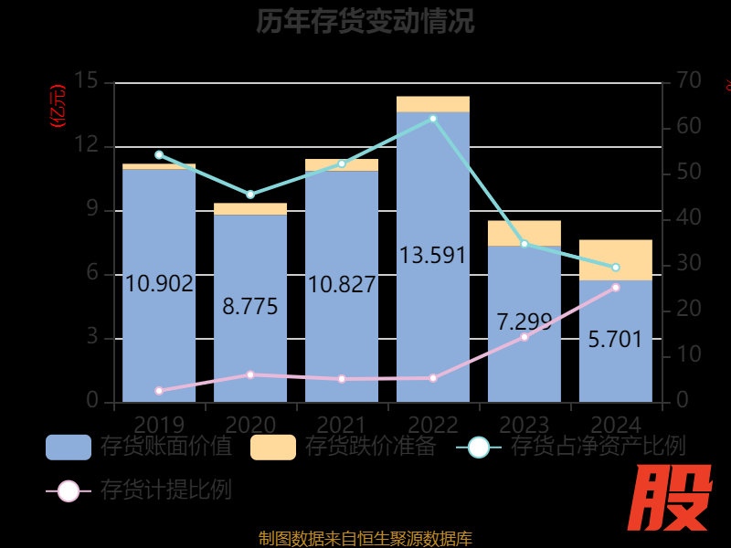 从存货变动来看,截至2024年末,公司存货账面价值为5.7亿元,占净资产的29.45%,较上年末减少1.6亿元。其中,存货跌价准备为1.9亿元,计提比例为25.04%。