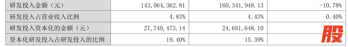 2024年全年,公司研发投入金额为1.43亿元,同比下降10.78%;研发投入占营业收入比例为4.83%,相比上年同期上升0.4个百分点。此外,公司全年研发投入资本化率为19.4%。