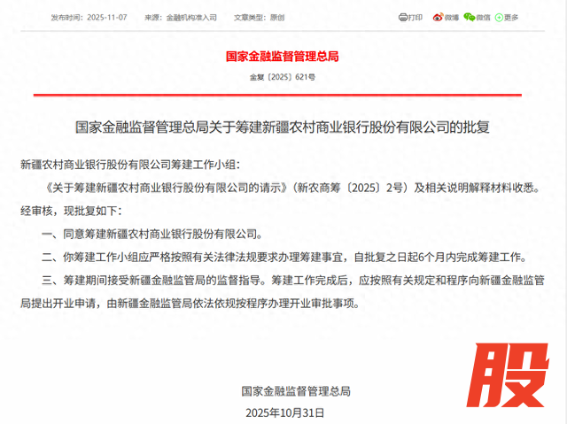 11月7日,国家金融监督管理总局披露的批复显示,同意筹建新疆农商银行。筹建工作小组应严格按照有关法律法规要求办理筹建事宜,自批复之日起6个月内完成筹建工作。批复的落款时间为10月31日。