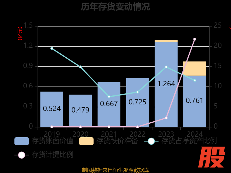 从存货变动来看,截至2024年末,公司存货账面价值为7613.24万元,占净资产的11.52%,较上年末减少5024.75万元。其中,存货跌价准备为2112.73万元,计提比例为21.72%。