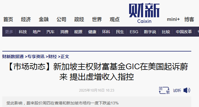 消息的源头,是财新网10月15日披露的独家报道:GIC 已于 2025 年 8 月在美国新泽西联邦法院提起诉讼,指控蔚来通过关联交易虚增收入并隐瞒对蔚能的控制关系。