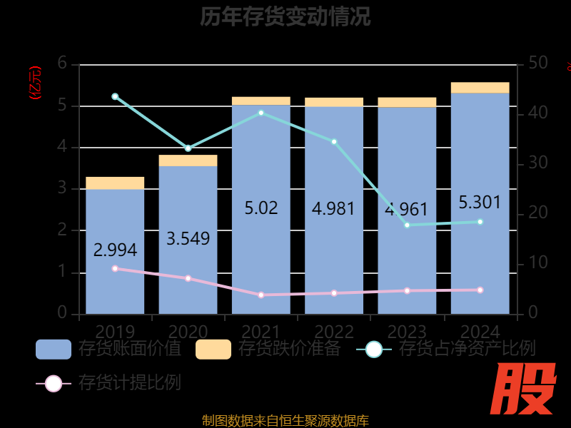 从存货变动来看,截至2024年末,公司存货账面价值为5.3亿元,占净资产的18.44%,较上年末增加3391.83万元。其中,存货跌价准备为2652.14万元,计提比例为4.77%。